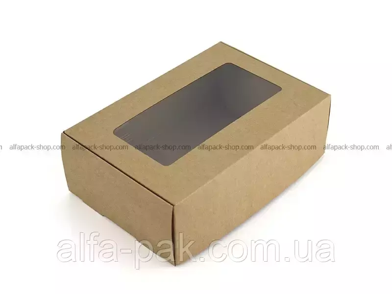 Коробка прямоугольная с окном крафт - удобная и практичная тара, изготовленная из не токсичного материала - крафт картона. Предназначена для хранения продуктов питания. Коробка прямоугольная с окном крафт используется для упаковки сладостей, печенья, натуральной пастилы, а также различных замороженных полуфабрикатов (пельмени, хинкали) и прочей готовой продукции готовой к употреблению. Внутренние стенки контейнера покрыты ламинацией, потому упаковка прочная и стойкая к воздействию влаги, жира и т.д.