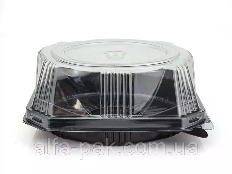 Данная упаковка чаще всего используется для расфасовки тортов, пирогов, выпечки, печенья, пирожных и другой кондитерской продукции. Благодаря тому, что контейнер изготовлен из прозрачного материала, покупатель легко сможет увидеть товар, не открывая при этом упаковку. Данная продукция состоит из двух частей, имеет открывающуюся съемную прозрачную крышку, плотно закрывающуюся при помощи внутренних ребер на плоском дне.и закрытии. Эта позиция актуальна для служб, специализирующихся на доставке еды; для продажи готовых блюд в отделе кулинарии в супермаркетах.