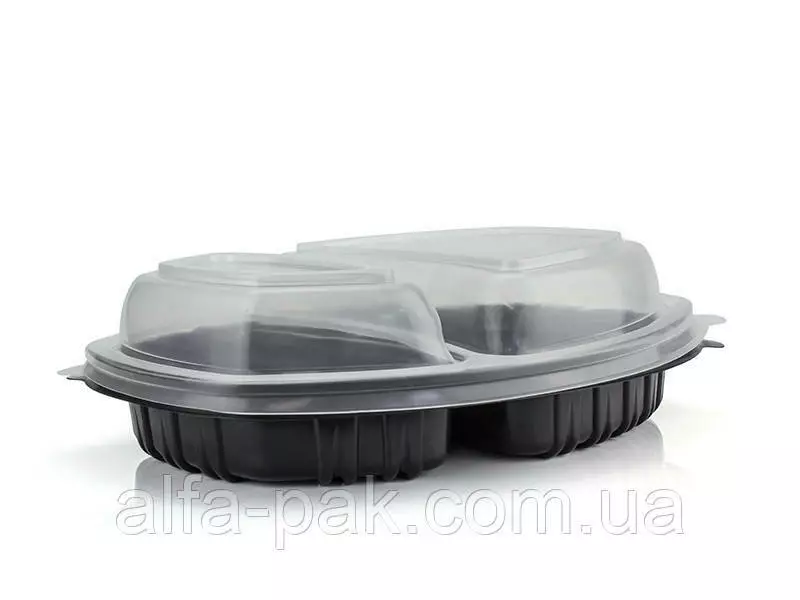 Контейнер овальный черный на 2 секции 257х202х37 мм черный с крышкой — это удобная и практичная упаковка, изготовленная из нетоксичных материалов, безопасных для организма. Используется для горячих и холодных блюд, приготовленных к употреблению. Материал контейнера плотный, не разрушается и при взаимодействии с горячей едой не вызывает дискомфорта в руках. Контейнер овальный черный на 2 секции 257х202х37 мм с крышкой можно приобрести без крышки. Эта позиция актуальна для служб, специализирующихся на доставке еды.