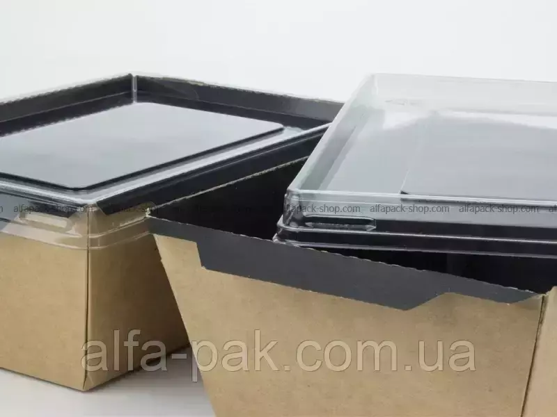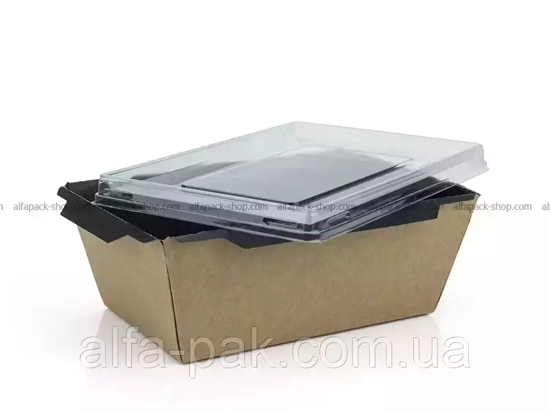 Контейнер прямоугольный крафт-черный с ПЭТ крышкой 1000 мл - удобная и практичная тара, изготовленная из не токсичного материала (крафт картона) для хранения продуктов питания. Данная упаковка чаще всего используется как ланч-бокс для расфасовки салатов, полуфабрикатов, кондитерских изделий, а также продукции, готовой к употреблению. Удобен для служб доставки и ресторанов с позициями на вынос. Благодаря тому, что крышка изготовлена из прозрачного материала (полиэтилентерефталат), покупатель легко сможет увидеть товар, не открывая при этом упаковку.