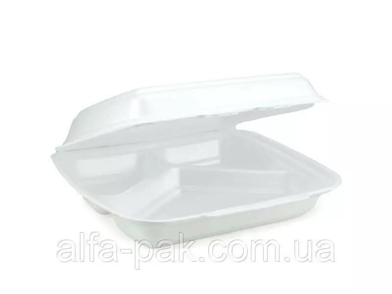 Ланч бокс из вспененного полистирола НР-3 белый - удобная и практичная тара, изготовленная из не токсичных материалов, которые являются безопасными для организма. Используется для горячих и холодных продуктов питания, подготовленных к употреблению. Материал упаковки плотный, не разрушается, а при взаимодействии с горячими блюдами не доставляет дискомфорта рукам. Еще одним достоинством тары из полистирола является минимальный вес и предотвращение появления конденсированной влаги. Ланч бокс из вспененного полистирола НР-3 белый имеет три секции и несъемную крышку, на которой расположены выступающие элементы крепежа, заходящие при закрытии в прорези на нижней части тары. Благодаря материалу, контейнер достаточно долго сохраняет еду теплой. Данная позиция актуальна для служб специализирующихся на доставке пищи.