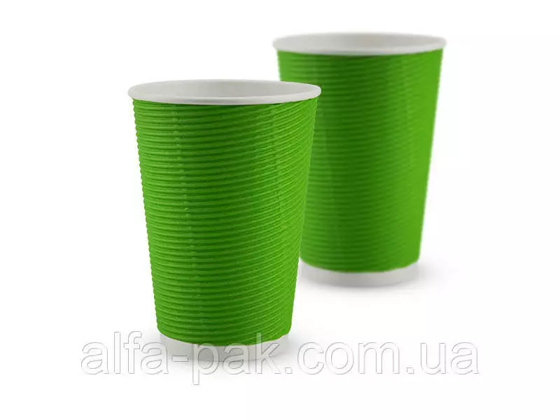 Стакан белый гофрированный зеленый F-волна горизонтальная, 340 мл