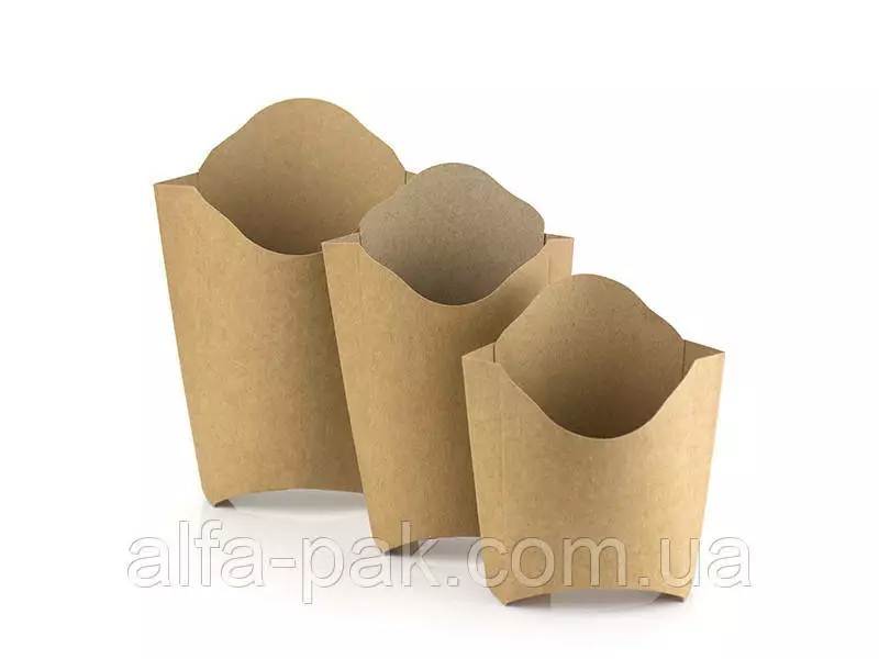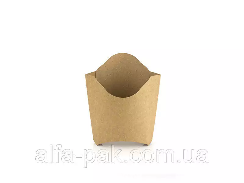 Картонная упаковка для картошки фри удобна и экологична. Данный вид упаковки применяется дла выдачи картофеля Фри в сетях кафе общественного питания и фаст фудах. Упаковка изготовленя из достаточно плотного крафт-картона, что предотвратит протекание масла и сохранит ваши руки чистыми.