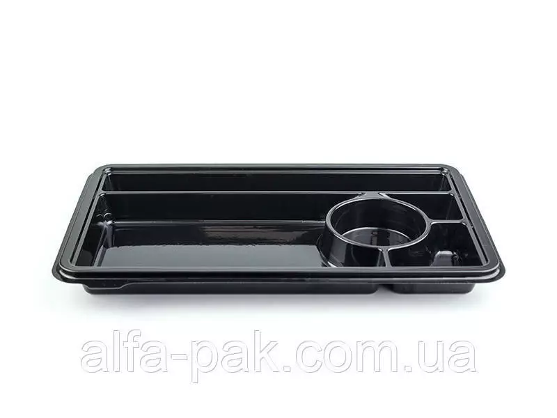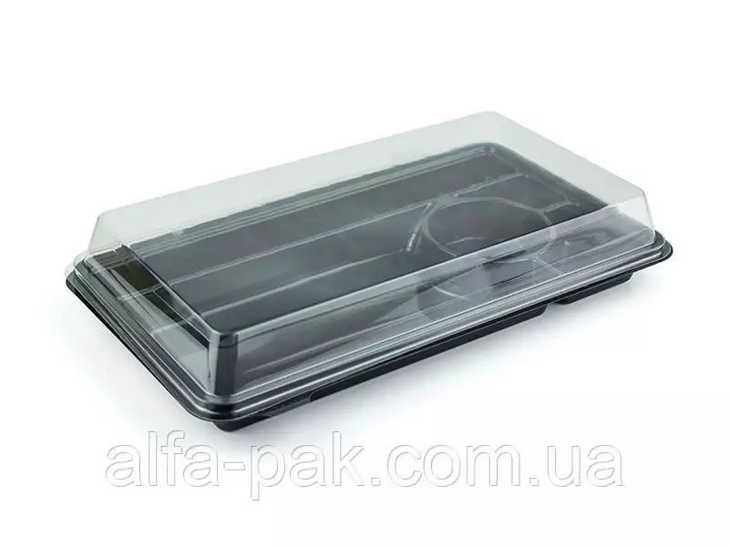Упаковка для суши это удобный комплект, состоит из дна и прозрачной съемной крышки, которая фиксируется при помощи ребер. Тара изготовлена из не токсичных материалов, рассчитана на безопасную транспортировку и хранение продуктов питания. Благодаря тому, что крышка изготовлена из прозрачного материала, покупатель легко сможет увидеть товар, не открывая при этом упаковку.
